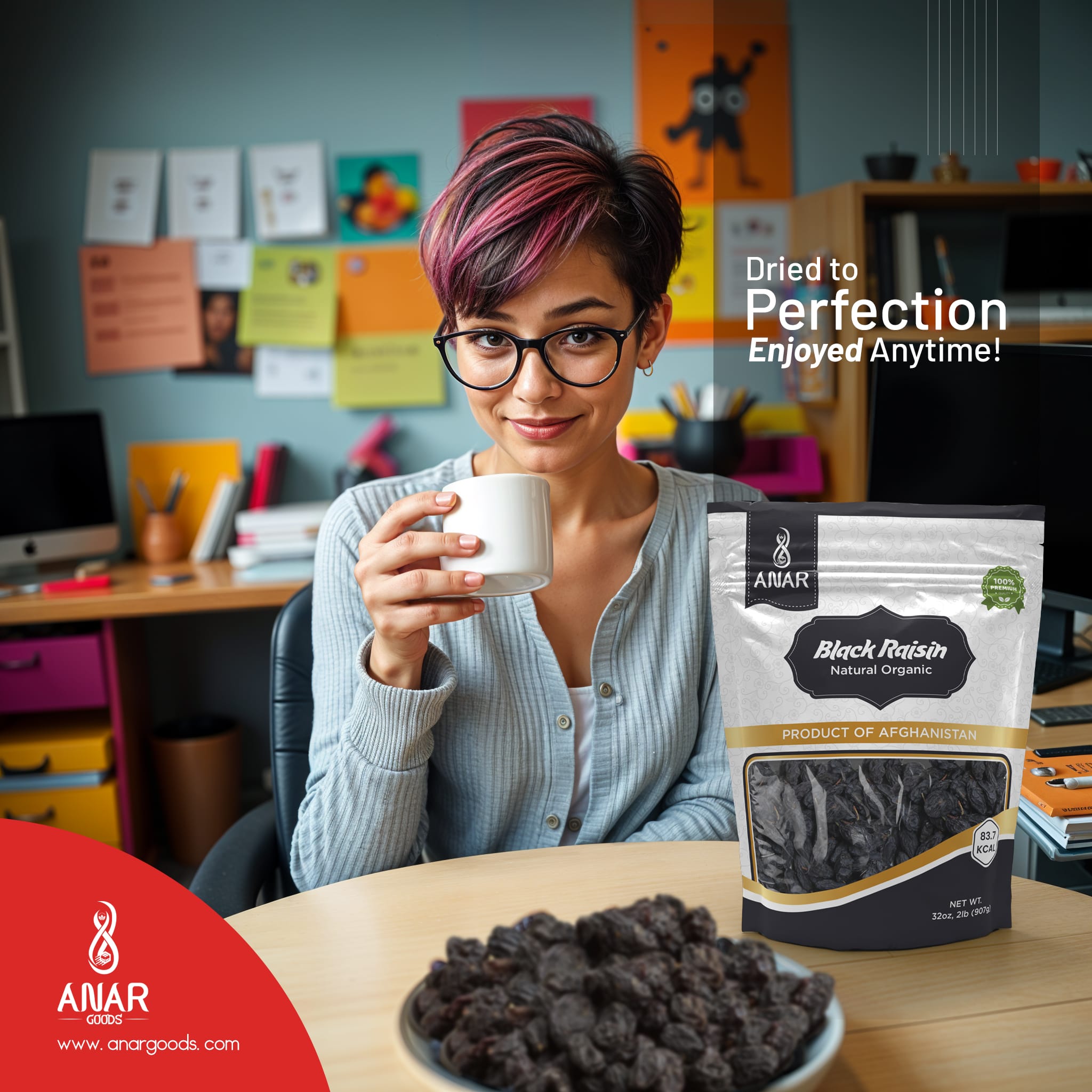 ANAR Black Raisin 32oz (907g) | Kishmish کشمش سياه | Seedless | Organic, Pure & Natural | Sweet & Unsulfured | Best for Cooking, Snacking, Oatmeal, Cookies, Baking & More | Resealable Stand-Alone Bag | From Afghanistan | Pack of 1